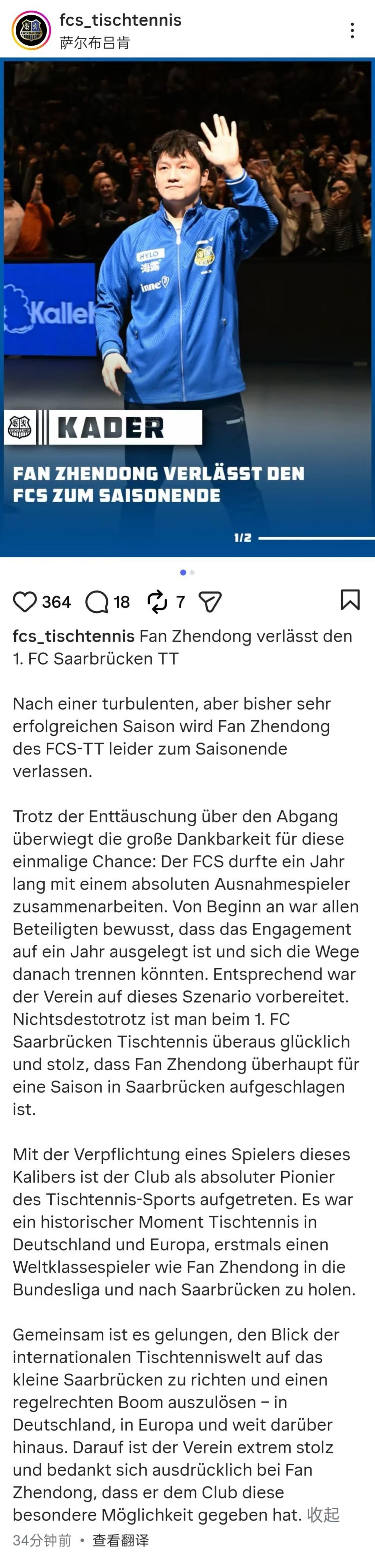 3月16日,德国萨尔布吕肯乒乓球俱乐部官方社媒宣布,樊振东将在本赛季结束后离开球队。