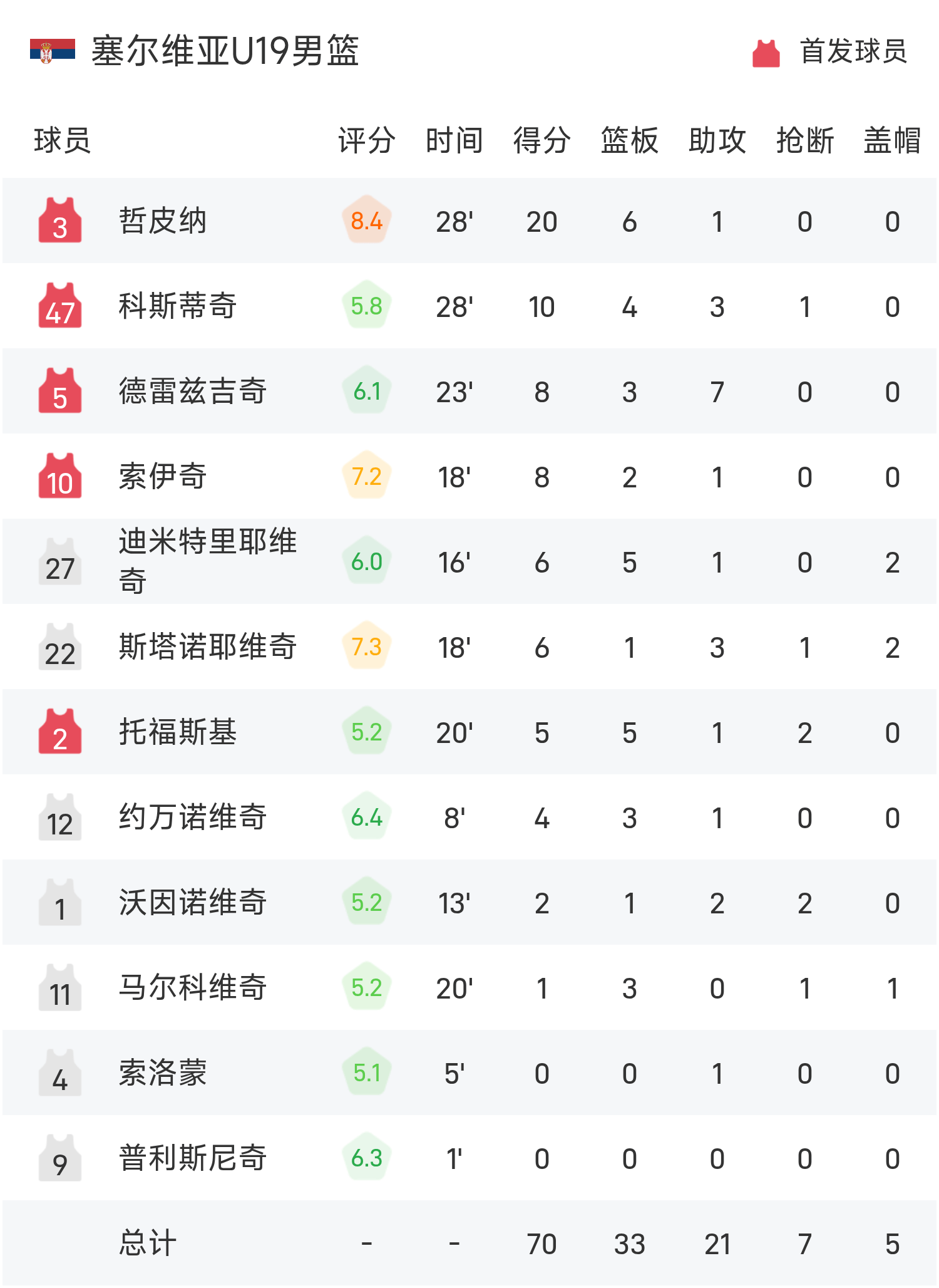 06月28日讯 25赛季U19世界杯小组赛,马里U19男篮对阵塞尔维亚U19男篮。双方全场战罢,马里U19男篮72-70战胜塞尔维亚U19男篮。巴加约科砍下全场最高的21分4板,率领马里U19男篮成功取胜。
