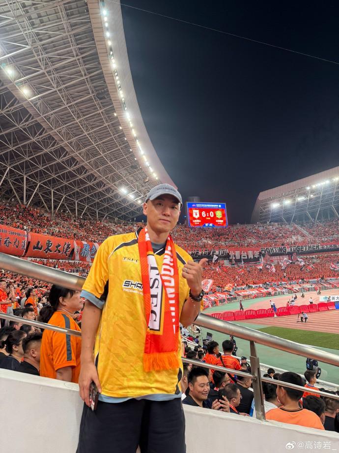 8月31日晚上,山东泰山主场6-0大胜北京国安,男篮球员高诗岩现场观看了比赛。