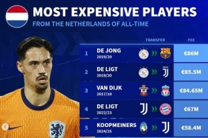 荷兰球员转会费:德容8600万欧第1 德里赫特前十占三 赖因德斯第6